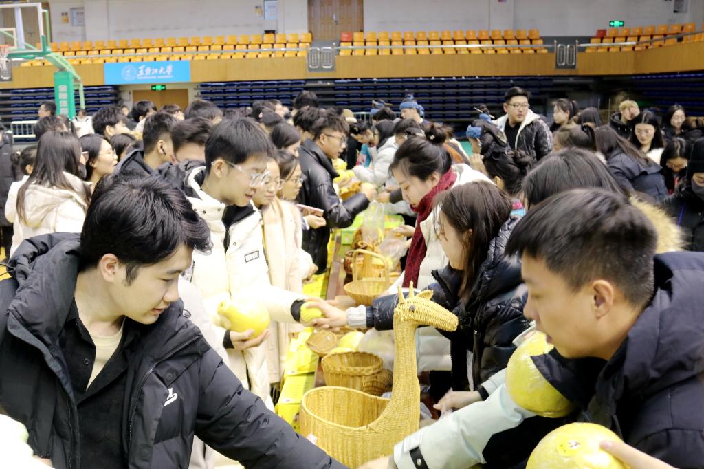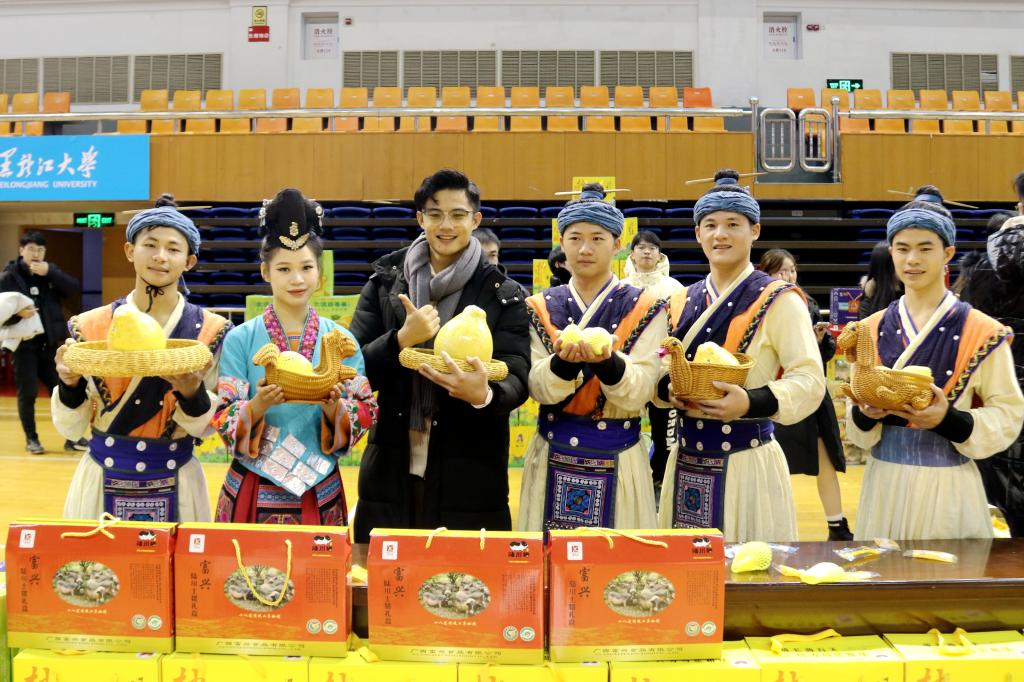 活動現場,廣西玉林的“小柚子”們還為師生們發放了沙田柚、百香果等廣西特產。