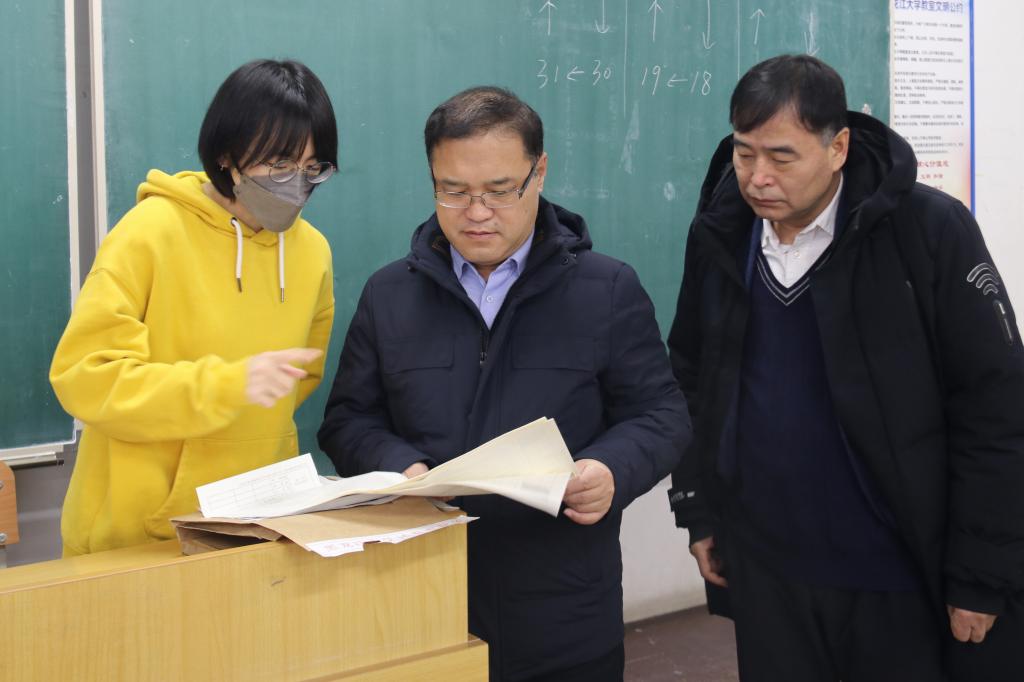 井立強一行走進考場,檢查監考人員的監考工作情況、試卷命題情況和考生答題狀況,詢問監考教師課程考核的成績占比,以往的通過率等情況。井立強與相應課程主考教師針對本學期教學開展情況和通過考試命題考核學生分析問題、解決問題能力等方面進行了交流。