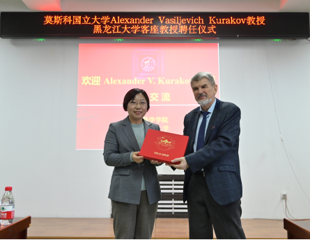 儀式上,井立強副校長代表黑龍江大學為亞歷山大?瓦西里耶維奇?庫拉克夫教授頒發聘書。生命科學學院院長李海英代表學院向亞歷山大?瓦西里耶維奇?庫拉克夫教授贈送黑龍江大學校園文創紀念品。