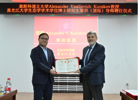 亞歷山大·瓦西里耶維奇·庫拉克夫教授對能夠受邀來到黑龍江大學表示誠摯感謝,表示很榮幸受聘黑龍江大學客座教授和黑龍江大學生態學學術學位博士研究生兼職(國際)導師,本次交流訪問是雙方友好合作的一個新的開始,期待在黑龍江大學進行深入的學術交流活動,未來將努力為黑龍江大學生態學學科的發展做出積極貢獻,強化團隊合作,在土壤生態學和真菌學等領域進行更深層次的合作與交流,共同助力黑龍江大學實現“雙一流”高水平大學建設的宏偉目標。