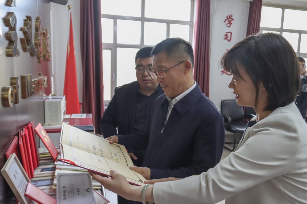 會后,遲寶旭查閱了馬克思主義學院建設的工作成果展。(攝影:王佳星 謝童 李卓穎 唐仁元)