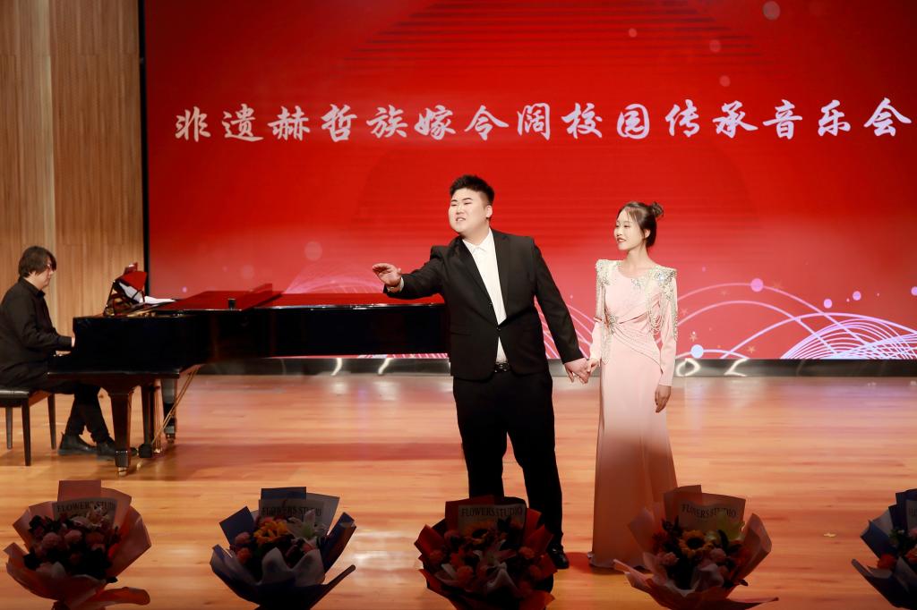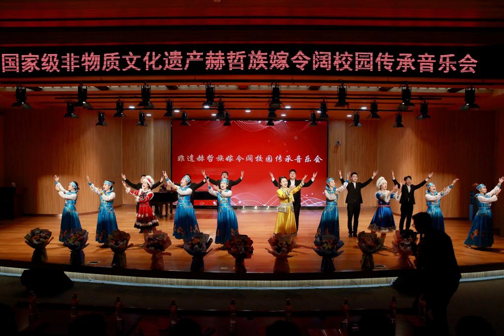 為進一步弘揚中華優秀傳統文化,鑄牢中華民族共同體意識,激發愛國情懷,加強國家級非物質文化遺產赫哲族嫁令闊音樂的挖掘、保護和傳承,弘揚龍江本土特色非遺音樂,5月15日晚,我校在三號樓地下報告廳舉辦非遺赫哲族嫁令闊校園傳承音樂會。本次音樂會由藝術學院赫哲族嫁令闊研學基地主辦,藝術學院音樂系教授李萃琳帶領的非遺赫哲族嫁令闊傳承創新團隊參演。校黨委副書記李君明,校黨委宣傳部、藝術學院相關同志、嫩江市前進鎮人民政府相關同志參加音樂會。