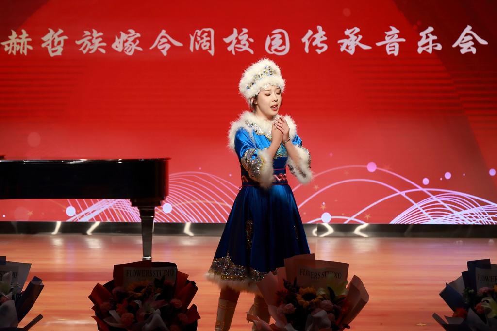 由赫哲族嫁令闊傳承創新團隊全體成員帶來的《盛世赫哲》拉開了校園傳承音樂會的序幕,悠揚的赫哲族小調勾勒出一副副幽靜甜美的畫面,富有寓意的歌詞把赫哲族人民奔向美好明天的革命激情和堅定信念表達的淋漓盡致。《赫哲人》展現了冉冉朝陽,聲聲杜鵑的赫哲風光,智慧和勤勞的赫哲人民迎來了繁榮和興旺。歌曲《獻給你,赫哲人的烏日貢》婉轉清麗,悠揚嘹亮的歌聲伴隨著優美舒展的鋼琴音展現了赫哲族深厚的傳統文化底蘊,凝聚和閃耀著民族智慧結晶。男女對唱《赫鄉戀歌》體現了赫哲族傳統民歌清新悅耳、耳目一新的特點,如一縷春風撲面而來,潺潺溪水聞聲而至。《我是烏蘇一滴水》用歌曲的形式表達了對黨的無限熱愛,歌頌了家鄉的發展變化,贊美了烏蘇市的好山好水好風光。獨唱曲目《口弦叮咚》雕刻巍峨,刻畫秀麗,唇齒間仿佛流出溪水沖擊巖石的叮咚聲,穿透了悠久的時光,訴說著人與自然間真摯的情感。四人合唱《釣魚歌》以輕松愉快的氣息鼓動著眾人,體現出作為漁獵民族最普通的日常生活和對于捕魚生活的熱愛。獨唱《溫吉妮》中動人的音樂旋律,充滿濃郁的民族特色,為聽眾帶來獨特的聽覺享受。《走進船歌唱響的地方》演唱者們通過肢體語言和富有情感的歌唱,將故事情節表現得淋漓盡致,也為音樂的演繹增添了更多的層次感。《圣其勒花》,讓人沉浸在悠揚流暢的旋律和優美動聽的曲調當中,仿佛置身于古老而神秘的赫哲族世界。在女聲獨唱《復興夢想》激昂而又充滿斗志的歌聲中,表達著中華兒女為實現中華民族偉大復興的中國夢而不斷奮斗的決心。以眾人合唱的《赫哲人最愛共產黨》作為此次音樂會的結束曲目,體現出赫哲人的民族精神和民族文化。