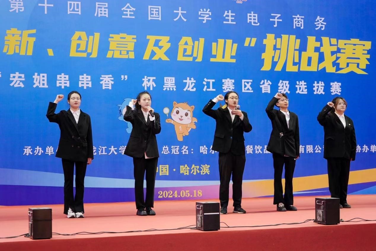 哈爾濱理工大學(xué)經(jīng)濟(jì)與管理學(xué)院楊彩霞副教授代表評(píng)委致辭,黑龍江大學(xué)信息管理學(xué)院電子商務(wù)專業(yè)21級(jí)學(xué)生項(xiàng)方怡團(tuán)隊(duì)帶領(lǐng)參賽選手進(jìn)行宣誓發(fā)言。
