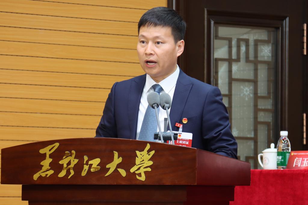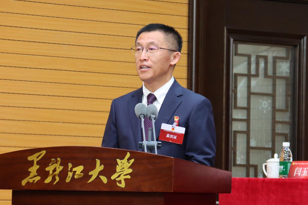 兄弟院校代表、哈爾濱工程大學團委書記郝琛致辭。他代表各兄弟院校向大會的召開表示熱烈祝賀。他表示,近年來,黑龍江大學團學工作始終堅持“服務學生成長成才,服務學校建設發展”的方向,在加強學生思想引領、大力繁榮校園文化、激發學生創新創業、廣泛開展志愿服務、加強團的自身建設等方面進行了一系列的創新實踐和有益探索,屢獲佳績。在未來的歲月中,哈爾濱工程大學團委將繼續與黑龍江大學團委攜手并肩、砥礪前行,共同譜寫共青團事業的新篇章。