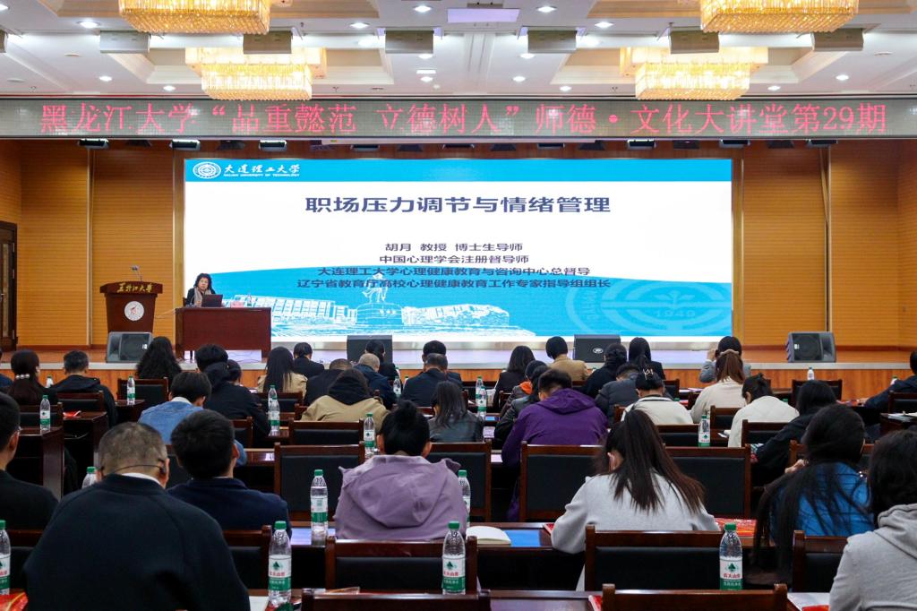 啟動儀式后,舉辦了黑龍江大學“品重懿范 立德樹人”師德·文化大講堂第29期。大連理工大學博士生導師、心理健康教育與咨詢中心總督導胡月教授為教職工開展題為《職場壓力調節與情緒管理》專題講座。胡月教授通過案例講解,圍繞陽光心態與壓力、壓力與健康效率、心理調節與應對三個方面展開分析。她強調,教職工由于職業特性,面臨教學、科研、家庭和個人發展等多方面壓力,學會情緒管理和壓力調節對提高工作效率至關重要。通過專業講授,胡月教授幫助教職工深入理解職場壓力的多種來源及心理機制,剖析職業、關系、壓力、情緒、健康之間的內在聯系,并教授壓力調適方法,幫助教職工覺察自身身心狀態,緩解工作壓力,提升情緒調適能力和工作效率,促進自我和諧。