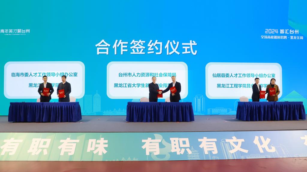 黑龍江省大學生就業創業指導中心與臺州市人社局合作簽約。