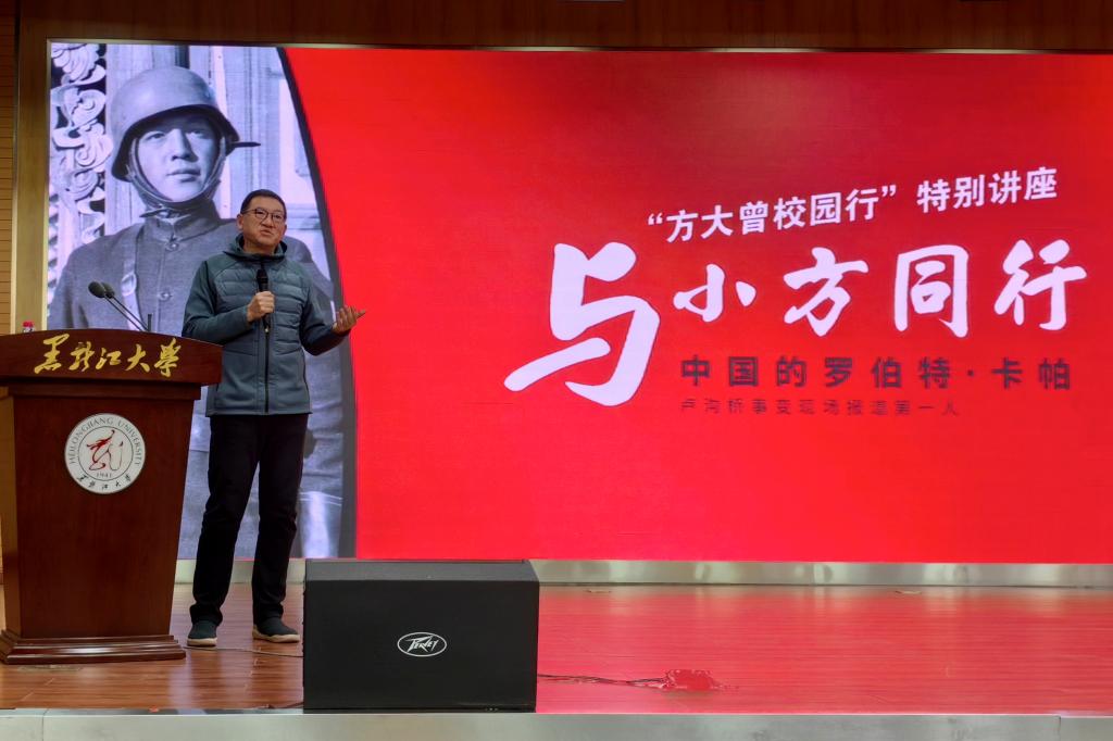劉鳳影在主持講座時表示,方大曾作為一名戰地記者,以手中的筆和相機為武器,與全國的青年人一道投身于戰爭之中,喚起國人抗戰激情,是人民的英雄。馮雪松先生作為業界工作者,具有當代新聞人認真負責的職業精神、專業素養和深切情懷,通過多年的努力探索,引發人們對重要新聞歷史人物的關注。希望黑大學子能夠發揚方大曾堅強、無私的高尚精神,并提倡與會師生向馮雪松先生學習,為國家、為民族、為新聞史、為新聞事業貢獻力量,承擔起新時代青年人的責任與使命。(攝影:孫晟偉 梁嵋茜 劉俊文;攝像:劉浩然)