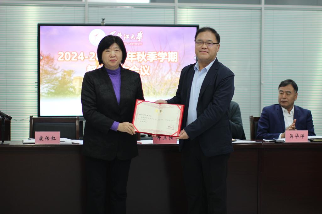 會上,范大偉簡要匯報(bào)了近期相關(guān)工作進(jìn)展情況,宣讀了學(xué)校《關(guān)于增補(bǔ)黑龍江大學(xué)督學(xué)的決定》。井立強(qiáng)為副總督學(xué)康傳紅教授以及新當(dāng)選督學(xué)劉東影、王曉東、康琳娜、金虎、姜艷、孫廣治、趙潔教授頒發(fā)聘書。