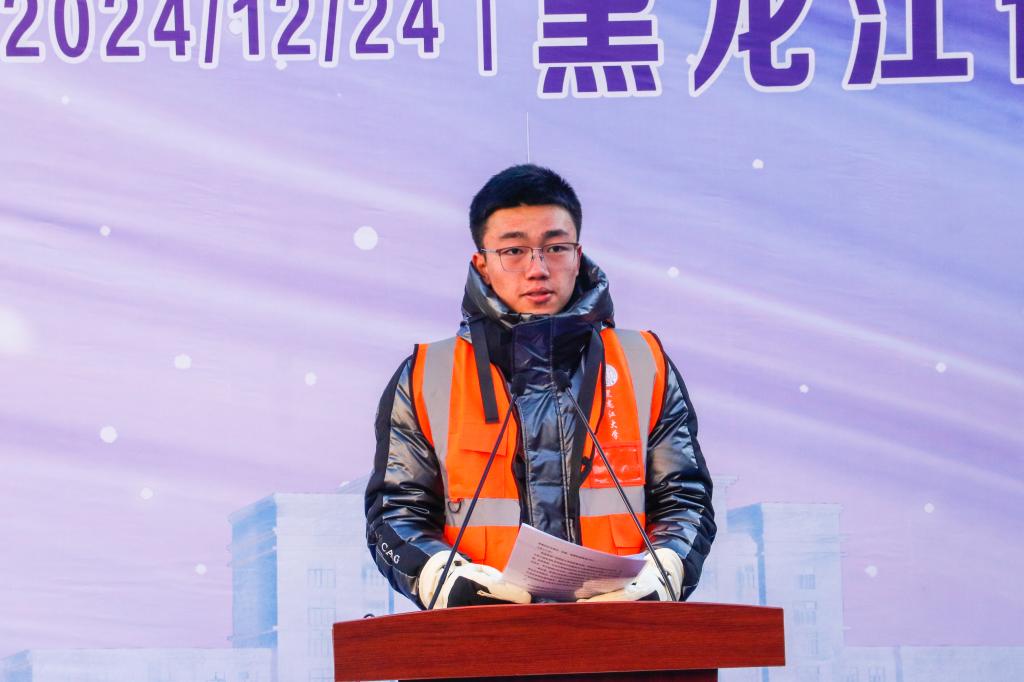 李君明在致辭中代表學校向蒞臨儀式的各位領導、嘉賓表示熱烈歡迎,并對為大賽籌備付出辛勤努力的工作人員及踴躍參與的高校師生表示感謝。他表示,該項大賽歷經多年發展,已成為展示高校師生才華的新窗口、促進文化交流的新紐帶、推動冰雪產業發展的新引擎以及加強校企協同合作的新橋梁。通過此次大賽,不僅能夠傳承弘揚冰雪文化,更為我省乃至我國冰雪事業發展貢獻智慧與力量。他希望,在第七屆黑龍江省高校冰燈冰雕技藝大賽中,各參賽隊員能夠充分展現自我,彰顯青春風采,書寫屬于新時代青年學子的冰雪文化壯麗篇章。最后,他預祝大賽圓滿成功,并祝愿所有參賽隊伍取得佳績,為冰雪藝術的傳承與發展貢獻青春力量。