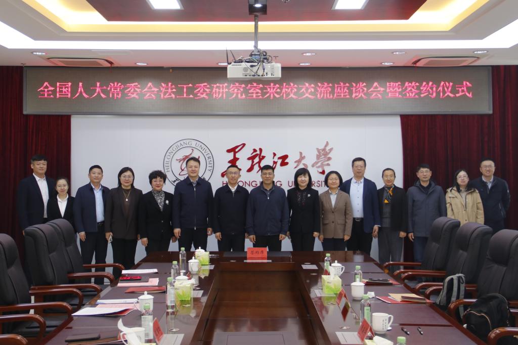 4月29日上午,全國人大常委會法工委研究室主任黃海華一行來校調研,并在主樓A802會議室舉行交流座談會暨簽約儀式。校黨委書記遲寶旭、副校長于文秀出席會議,省人大法制委、常委會法工委相關負責同志,我校高級翻譯學院、法學院、文學院、俄語學院、俄羅斯語言文學與文化研究中心相關負責同志參加會議。會議由于文秀主持。