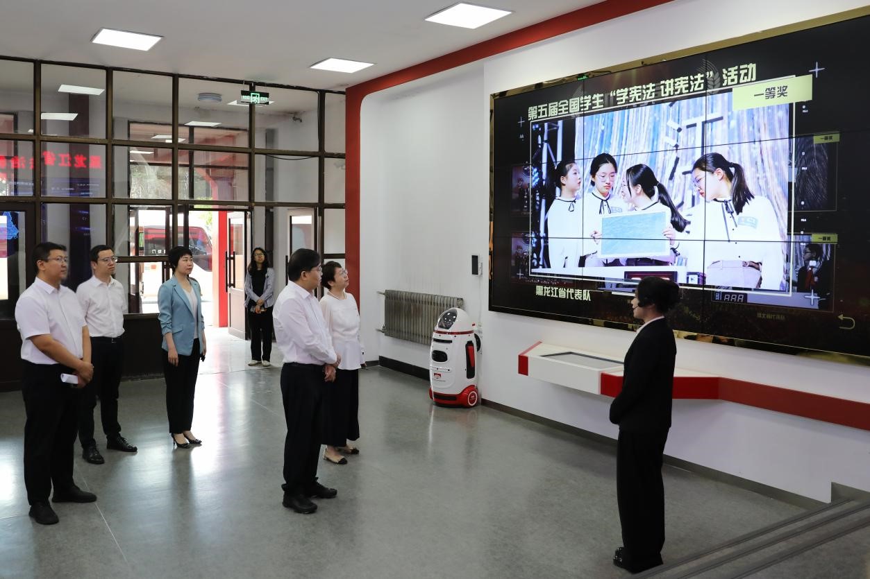 在黑龍江省青少年學生法治教育實踐基地,張文斌一行依次參觀了序廳、憲法儀式廳、憲法教育區、憲法體驗區、法治文化廳,現場體驗了人工智能、虛擬現實等技術應用,現場感受了情景模擬、案例展示等互動模式。張文斌充分肯定了基地的沉浸式教育與創新實踐成果。