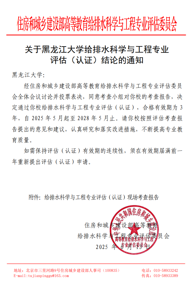 近日,住房和城鄉(xiāng)建設(shè)部高等教育給排水科學(xué)與工程專業(yè)評估委員會印發(fā)《關(guān)于黑龍江大學(xué)給排水科學(xué)與工程專業(yè)評估(認(rèn)證)結(jié)論的通知》,我校給排水科學(xué)與工程專業(yè)順利通過首次專業(yè)評估(認(rèn)證),是我校首個(gè)通過住房和城鄉(xiāng)建設(shè)部專業(yè)評估(認(rèn)證)專業(yè)。住房和城鄉(xiāng)建設(shè)部專業(yè)評估(認(rèn)證),包含在工程教育專業(yè)認(rèn)證體系之內(nèi),接受住房和城鄉(xiāng)建設(shè)部、教育部、全國工程教育專業(yè)認(rèn)證機(jī)構(gòu)的業(yè)務(wù)指導(dǎo)。