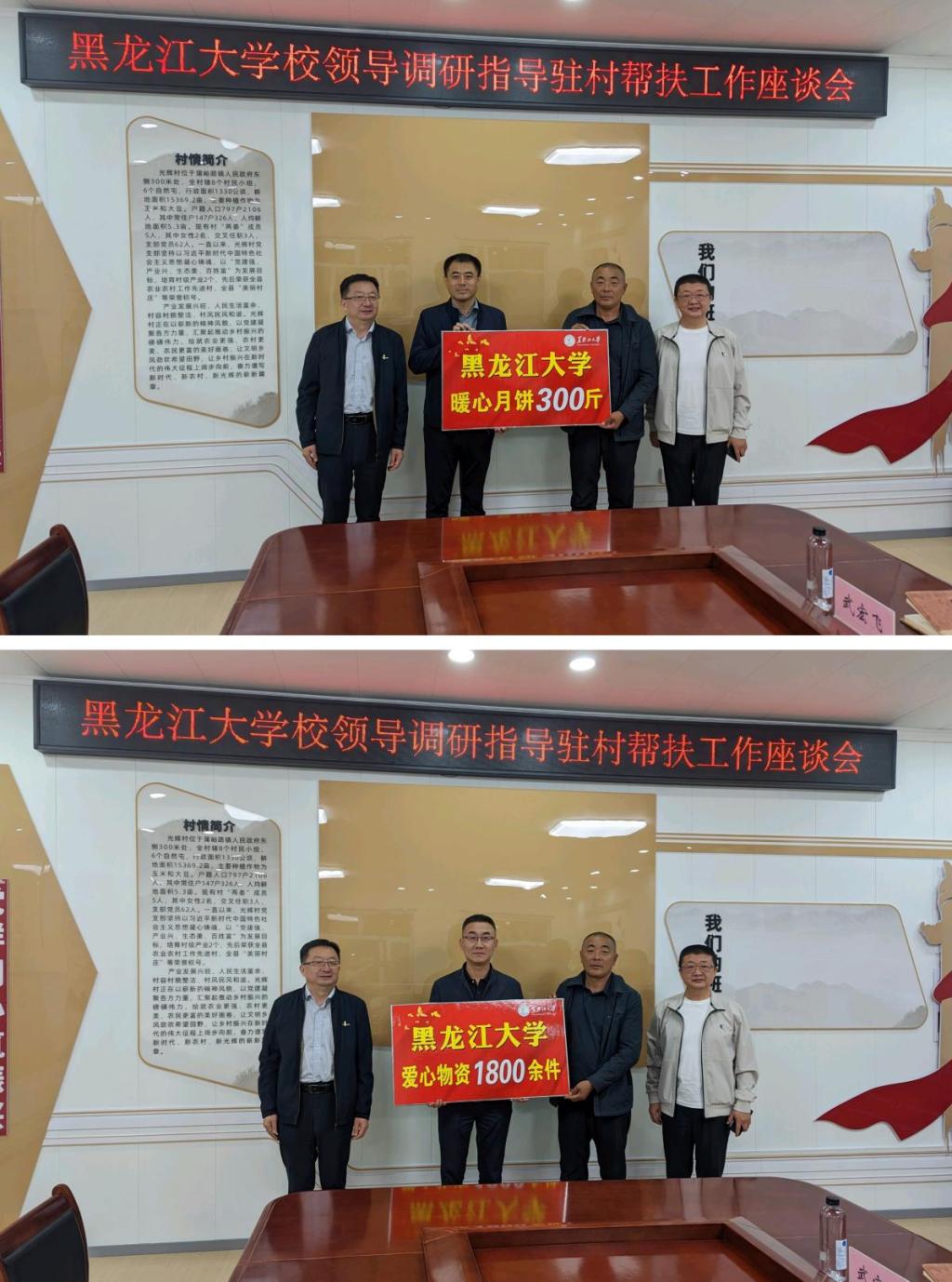 在調(diào)研座談會上,駐村工作隊隊長、第一書記吳迪圍繞建強(qiáng)組織、興村富民、加強(qiáng)治理、為民服務(wù)等工作職責(zé),將3個月來開展的工作及下一步工作思路進(jìn)行了匯報。校工會副主席李文達(dá)將“師情潤?quán)l(xiāng)土·愛心聚光輝”活動所募集的1800余件物資、后勤保障處處長翟庚將專門定制的300余斤“暖心月餅”轉(zhuǎn)交給光輝村黨支部書記。