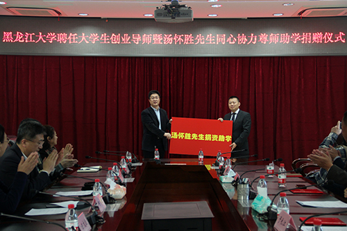 民進黑龍江經濟界會員聯誼會副會長、哈爾濱盛杰盛醫學儀器試劑有限公司董事長湯懷勝向我校教育發展基金會捐贈尊師助學基金10萬元。學校辦公室主任、教育發展基金會秘書長陳文遠代表學校接受捐贈。