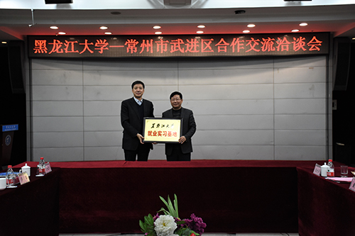 曲科軍副書記向武進區中俄科技產業園頒發了“黑龍江大學就業實習基地”銅牌,戴士福區長向我校頒發了“常州市武進區中俄科技產業園黑龍江大學人才工作站”銅牌。
