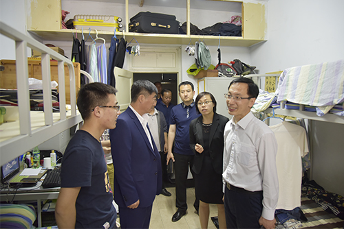 檢查組深入A區留學生公寓餐廳、新圖書館、陽光講壇及部分教學樓、寢室樓等地,查看校園公共場所、教室、食堂、寢室的衛生情況,并現場辦公,對一些墻體老化滲水、瓷磚脫落、地面鋪設等問題共同商討,明確責任,落實解決方案。