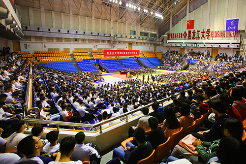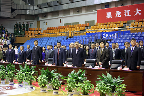 在莊嚴(yán)的國歌聲中,全體師生起立,行注目禮;在黑龍江大學(xué)校歌《歲月如歌》的旋律中,黑龍江大學(xué)校旗冉冉升起。