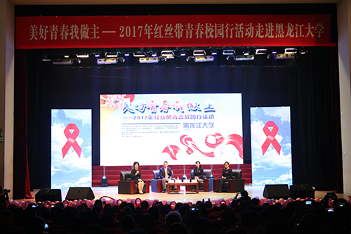 為了普及艾滋病防控知識,提升大學生的防艾意識,傳遞青春正能量,10月31日晚,由我校承辦的“美好青春我做主”——紅絲帶青春校園行活動在我校音樂廳舉行。中國性病艾滋病防治協(xié)會秘書長王新倫、共青團黑龍江委員會副書記陳凱云、黑龍江省性病艾滋病防治協(xié)會會長邢濟春,省衛(wèi)計委疾控處、省疾病預防控制中心、省教育廳體衛(wèi)藝處等有關負責同志,紅絲帶健康大使鞠萍、沈娜,我校黨委副書記丁宏、青年師生代表等共計1000余人參加了此次活動。