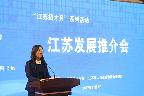 會上,校黨委副書記丁宏代表學校致辭。她首先回顧了黑龍江大學與江蘇省多年保持的深厚的友誼和緊密的聯系,截至目前我校已與江蘇省人社廳和13個地市及各區縣人才部門簽署人才合作協議22份,5個地市在我校設人才工作站,100余名黑大學生作為江蘇省地市形象大使活躍在黑大校園,助力江蘇引才。在江蘇科技鎮長團中,學校黨委共選派27名專家、干部到江蘇掛職,有力促進了我校與江蘇省更為廣泛的人才合作和產學研對接。最后她希望同學們珍惜和把握住大好機遇,找到適合自己的崗位和平臺,為國家在‘一帶一路’經濟社會發展貢獻自己的力量!