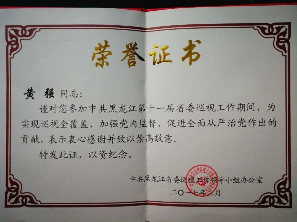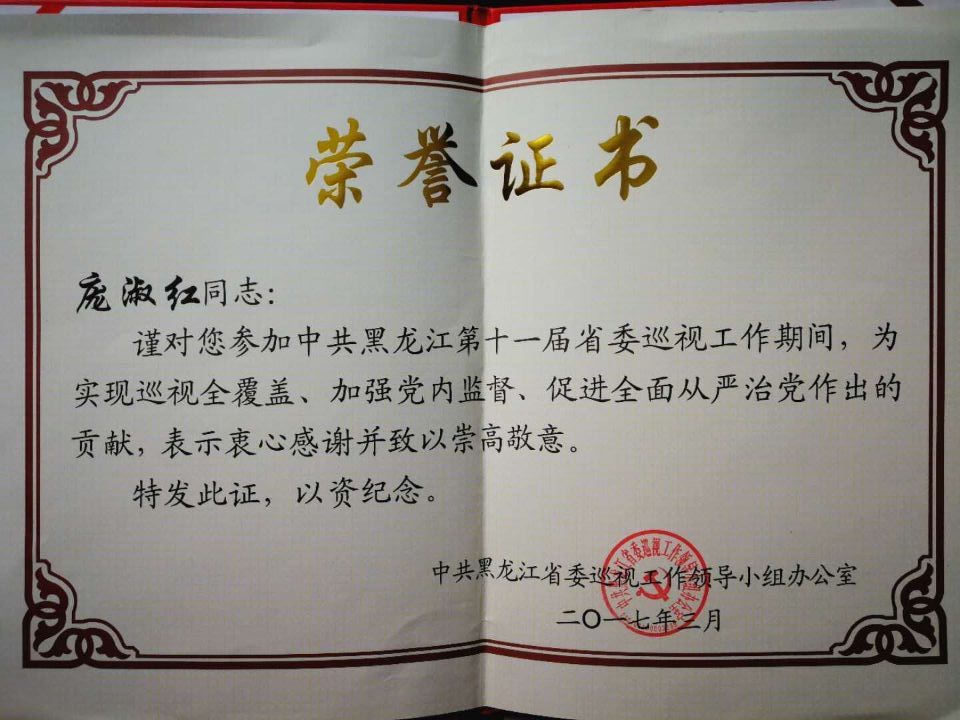 近日,中共黑龍江省委巡視工作領導小組辦公室向我校下發了龐淑紅、黃強兩位同志的榮譽證書。2016年,我校紀委副書記龐淑紅同志、國有資產管理處處長黃強同志先后被抽調巡視組掛職,參加了中共黑龍江第十一屆省委巡視工作。在參加巡視工作期間,兩位同志認真學習巡視工作理論,迅速進入工作角色,堅守各項紀律,充分發揮專業優勢和自身特長,不遺余力完成各項工作任務,表現突出。省委巡視工作領導小組為表彰他們在加強黨內監督、促進從嚴治黨工作中做出的貢獻,向他們頒發了榮譽證書。