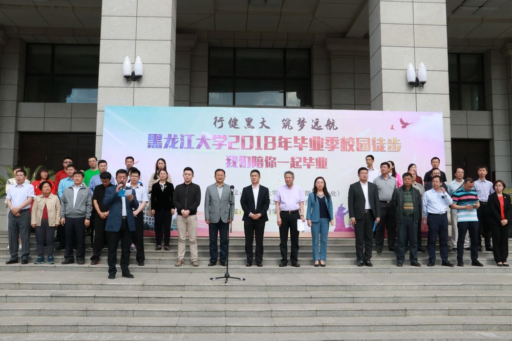 付宏剛校長(zhǎng)向全體參加活動(dòng)人員表示熱烈歡迎,向華夏銀行學(xué)府路支行的支持表示衷心感謝。他表示,全校各部門(mén)、各學(xué)院竭盡全力推進(jìn)畢業(yè)生離校工作,目的是為畢業(yè)生同學(xué)們順利畢業(yè)保駕護(hù)航。為了同學(xué)們能夠珍惜大學(xué)時(shí)光,培養(yǎng)大家的感恩意識(shí),激發(fā)大家愛(ài)校榮校情懷,更為同學(xué)們能夠有序、安全、文明離校,為大學(xué)生活畫(huà)上一個(gè)圓滿的句號(hào),今年,我校按照畢業(yè)生遠(yuǎn)航計(jì)劃,制定了“十四個(gè)一”畢業(yè)生主題教育方案,全校上下開(kāi)展了一系列具有紀(jì)念意義的教育活動(dòng),畢業(yè)季校園徒步活動(dòng)就是其中最重要的活動(dòng)之一。他希望通過(guò)這次校園徒步,讓大家再重走一次校園路,再重感受校園里的一草一木,重新回憶大學(xué)四年的的一點(diǎn)一滴;也希望在十年后、二十年后,再次回到母校相聚的時(shí)候,大家能擁有一段美好而難忘的回憶。付宏剛校長(zhǎng)最后寄語(yǔ)全體畢業(yè)生,銘記夢(mèng)想和責(zé)任,在今后的工作生活中,秉承“志存高遠(yuǎn)、愛(ài)國(guó)奉獻(xiàn)、艱苦奮斗、自強(qiáng)不息”的黑大精神,腳踏實(shí)地走好人生每一步,走向人生美好的未來(lái)!付宏剛校長(zhǎng)宣布“行健黑大 筑夢(mèng)遠(yuǎn)航”黑龍江大學(xué)2018年畢業(yè)季校園徒步活動(dòng)正式開(kāi)始。