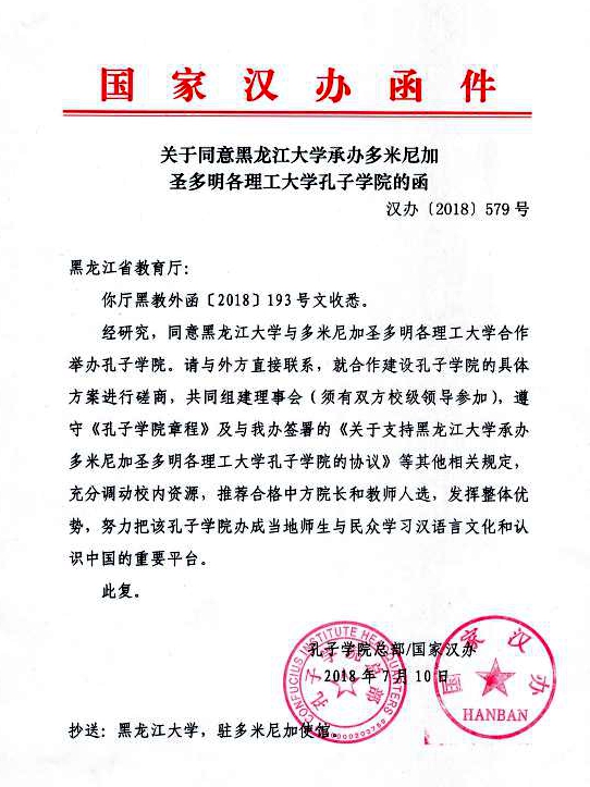 近日,我校收到漢辦〔2018〕579號《關于同意黑龍江大學承辦多米尼加圣多明各理工大學孔子學院的函》,孔子學院總部/國家漢辦正式批準同意我校與多米尼加圣多明各理工大學合作舉辦孔子學院。