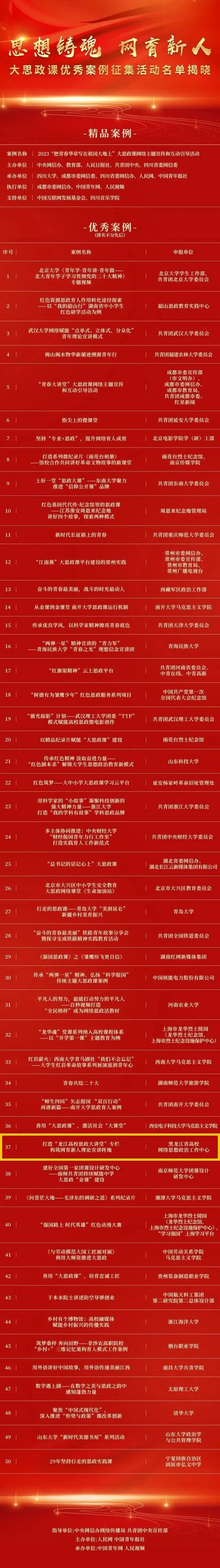 近日,由中央網信辦網絡傳播局、共青團中央宣傳部指導,人民網、中國青年報社共同主辦的“思想鑄魂 網育新人”大思政課優秀案例征集活動評選結果揭曉,經初選、終選以及結果公示,產生精品案例1件、優秀案例50件。黑龍江省高校網絡思想政治工作中心(黑龍江大學)申報的《打造“龍江高校思政大講堂”專欄 構筑網育新人理論宣講陣地》獲評優秀案例,是黑龍江省唯一入選的大思政課優秀案例。