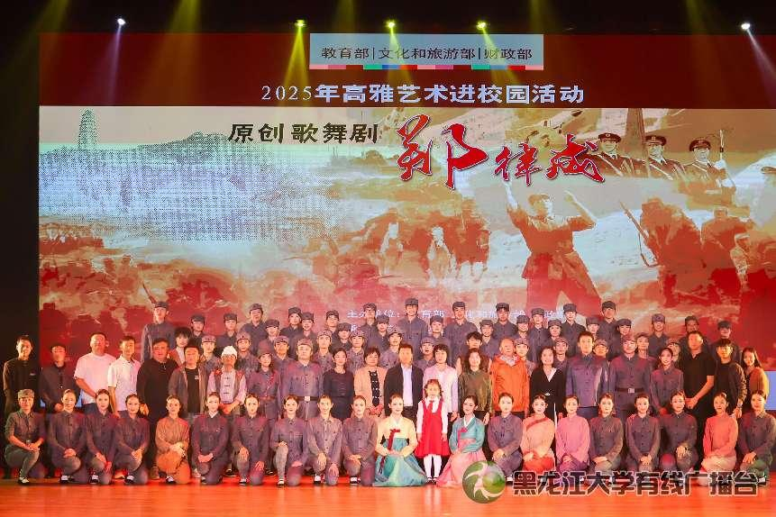 歌舞劇《鄭律成》的成功演出,不僅為學校建校84周年增添了紅色文化注腳,更將“高雅藝術+紅色基因”的元素融入校園文化體系,通過師生自發跟唱經典旋律、演出后熱議抗聯精神等場景,讓紅色文化從“舞臺呈現”走向“日常共鳴”。兩校以《鄭律成》為紐帶,共同豐富了校園文化的內涵,讓紅色主旋律成為校園文化建設的核心底色。