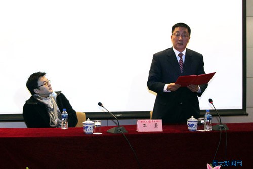 講座開始前,我校校長張政文向石墨頒發了“黑龍江大學客座教授”聘書。張校長說,“石墨先生的到來,并不僅僅是進行一場講座,而是對我們最古老的當下生存方式的傳授;石墨先生不僅僅是一位藝術家,而是用他的藝術貢獻于社會。”“黑龍江大學,是一個給學生精神,讓學生有自我意識、自我主張和自我精神的大學,她讓學生在這里具有熱愛生活的精神、勇于創新的精神和不斷自我超越的精神。”張校長希望在座的同學們從石墨先生的講座中汲取“養料”,在生活中感受藝術的魅力。