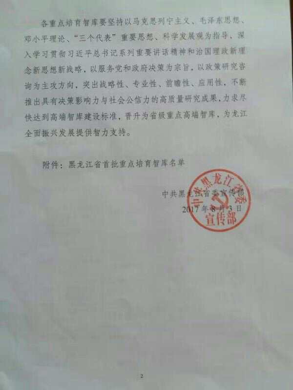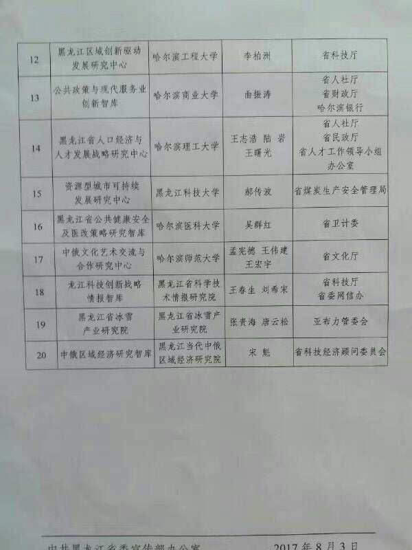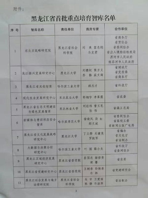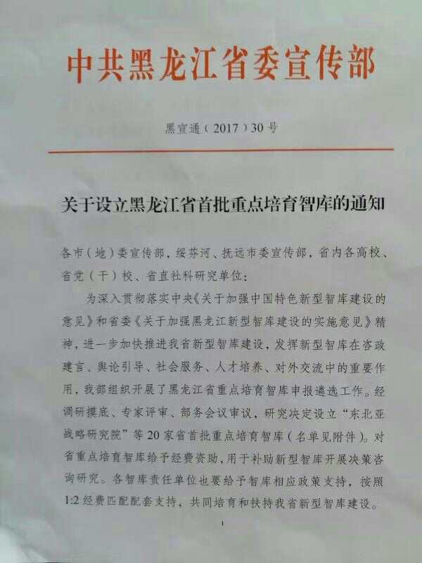 為深入貫徹落實(shí)中共中央辦公廳、國(guó)務(wù)院辦公廳《關(guān)于加強(qiáng)中國(guó)特色新型智庫(kù)建設(shè)的意見(jiàn)》和黑龍江省委省政府《關(guān)于加強(qiáng)黑龍江新型智庫(kù)建設(shè)的實(shí)施意見(jiàn)》,進(jìn)一步加快推進(jìn)黑龍江省新型智庫(kù)建設(shè),黑龍江省委宣傳部組織開(kāi)展了黑龍江省重點(diǎn)智庫(kù)培育申報(bào)遴選工作,經(jīng)過(guò)摸底調(diào)研、專家評(píng)審、部務(wù)會(huì)議審議,研究決定設(shè)立20家省首批重點(diǎn)培育智庫(kù)。其中,我校組織申報(bào)的“龍江振興發(fā)展研究中心”、“黑龍江省文化發(fā)展戰(zhàn)略研究中心”成功入選。
