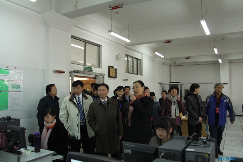會后,專家組成員在何穎副校長的陪同下對我校相關教學機構及設施進行了實地考察。他們先后走訪了應用外語學院的教學機構及設施,圖書館的外文中心、純語言類閱覽室、電子閱覽室,實驗樓語音室和四號教學樓的網絡學習室,并在四號教學樓410室觀看了大學交互英語學習和管理平臺的演示。